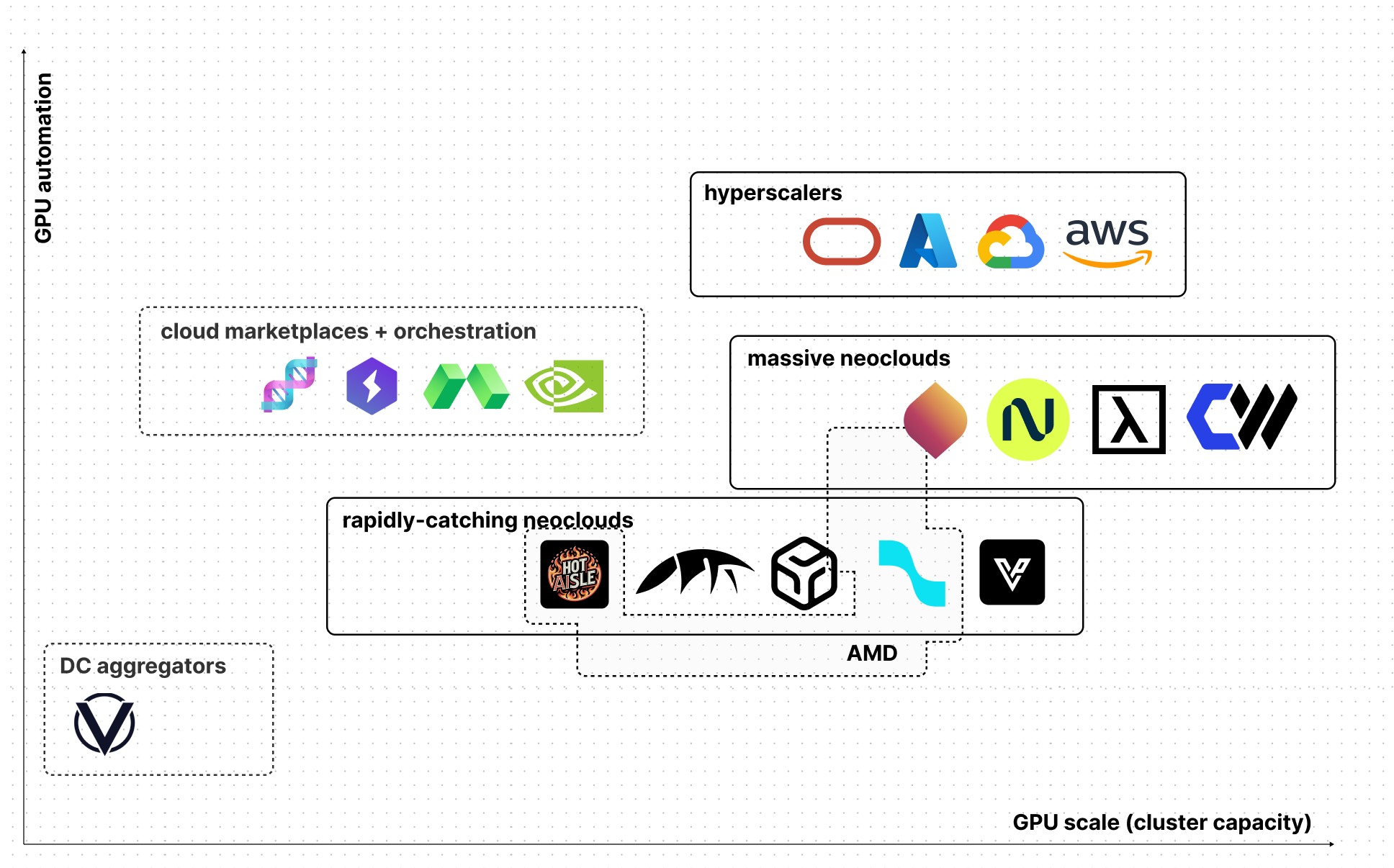 Rapidly-catching neoclouds | Smaller GPU-first players building out aggressively | RunPod, DataCrunch, Voltage Park, TensorWave, Hot Aisle |
