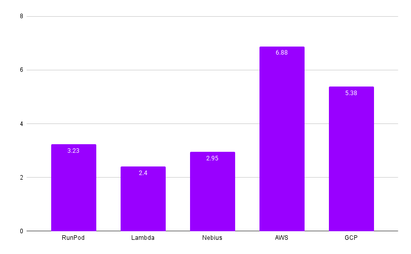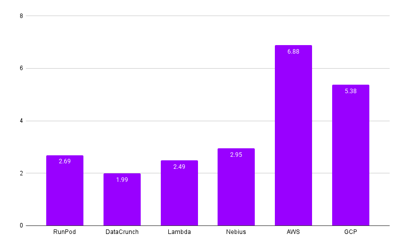 Price is per GPU and excludes full CPU, disk amount and type, and network factors. 8xGPU multi-node setups with fast interconnects will cost more.